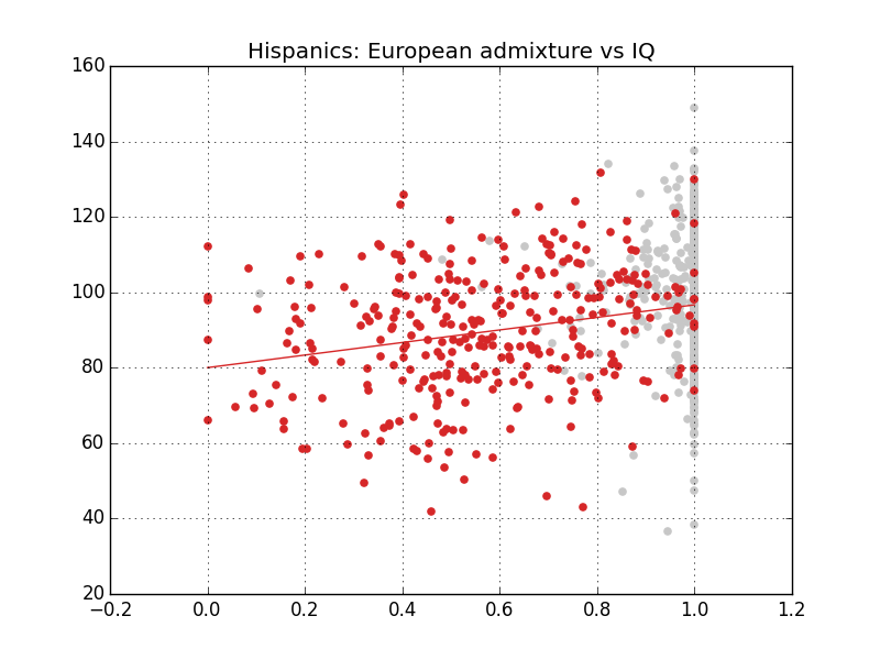 However, from a hereditarian perspective, two persons belonging to the same ethnic group can sometimes be differentiated by different amounts of a certain genetic ancestry. So in ethnic groups whose members have varying degrees of admixture of some original founding populations we can put the hereditarian hypothesis to the test. This is the case for African-Americans, who have varying degrees of European ancestry and for Hispanics, who are mostly a mixture of Europeans, Amerindians and Africans.