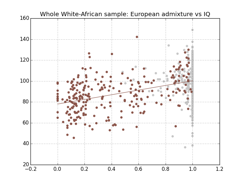 The slope of 23.283 immediately gives us the gap between 100% European and 100% African, while the intercept provides us with the IQ of a 100% African African-American. The regression line overshoots the mean white IQ. This might be noise, or legitimately smarter white genes in the black population, or Amerindian admixture in the whites reducing the mean, or a slight environmental downward bent of the left part of the plot. But whether we take the estimated gap, or the difference between actual white mean IQ and the 100% African IQ, the result is always strikingly close to Galton’s estimate.