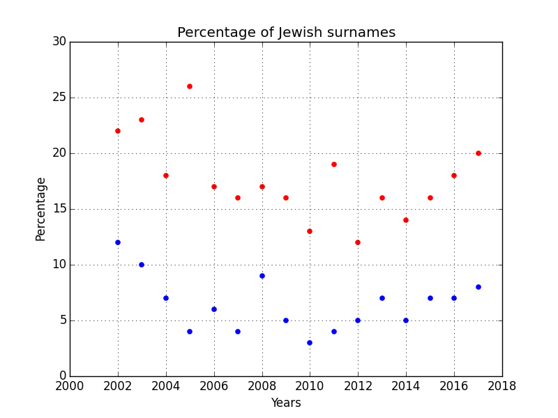 So we are naturally interested in the Ashkenazi representation among songwriting competition winners. We try to calculate it using two datasets of Ashkenazi names [1],[2]. Using the first set of names we count 17% percent Ashkenazi names among songwriting competition winners, using the second set of names we only find 6.5%. This mostly tells us that we cannot reliably assess the number of Ashkenazim with this method. There are too many names listed that are quite common among gentiles as well. And on the other hand, it is unclear how complete the lists are.