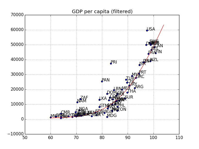 A better way than looking at correlations to drive home the meaning of the hereditarian hypothesis is to visualize how mean IQ of percentiles change. The hereditarian hypothesis posits, that IQ varies continuously with admixture. This means that the IQ averages of admixture percentiles will more or less linearly increase.