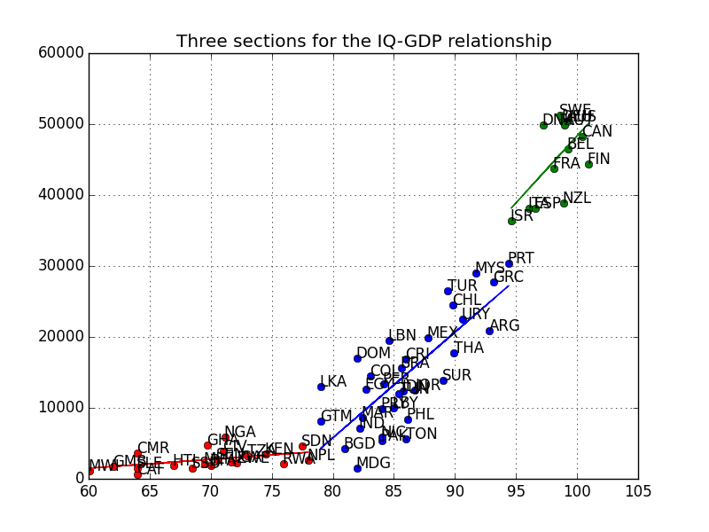 To show this effect for each percentile would require a much larger data set. This data set is almost too small and heterogeneous to show the effect convincingly for quartiles. For example, as we have seen, the Hispanic IQ is slightly depressed compared to the same admixture in African Americans. Because the middle region of European admixture is dominated by Hispanics this results in a depressed middle if we use the whole sample.