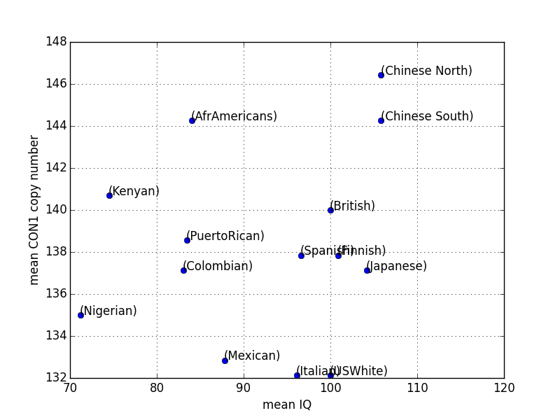 However, if we take a look for example at the figure for CON1, there is a visible correlation on the right hand side, which corresponds to Eurasians. And indeed, if we restrict the data only to the Eurasian groups, we get two strong positive correlations with p<0.05 for CON1 and CON2. Of course, this proves nothing at all, except that eyeballing data is enough to conjure low p-values out of thin air.