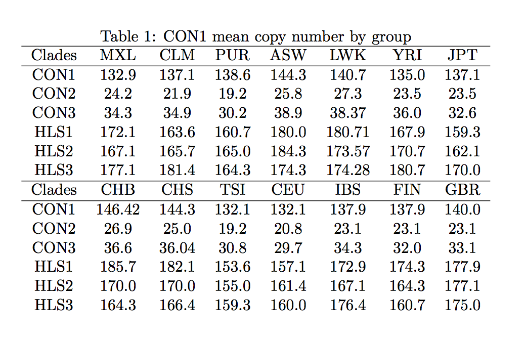 There is data out there to test this hypothesis. The 1000 Genomes Project has collected whole genome sequencing data from more than 2000 persons coming from a few dozen different populations [5]. I was already gearing up to find out how to extract the copy numbers directly from the genome data. It would have been pretty annoying, starting with the fact that Duf 1220 has changed names three times and is not even a full protein, so it was already difficult to find out the exact sequences I was going to look for [6].